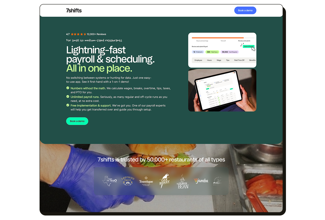 Design objective: Design a high‑impact, conversion‑focused landing page that highlights 7shifts’ payroll integration as a logical extension of scheduling aimed at restaurant operators evaluating both scheduling and payroll solutions.