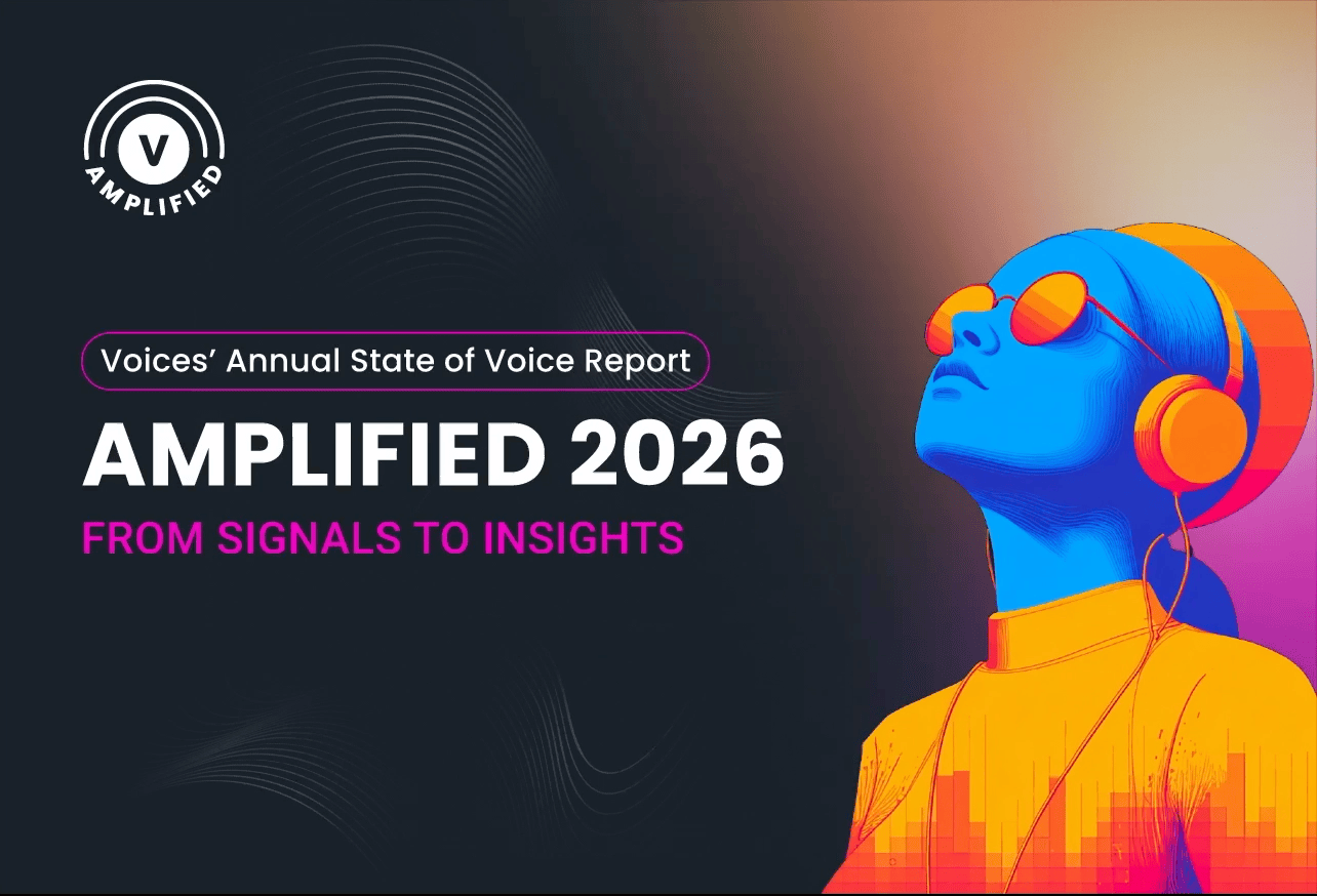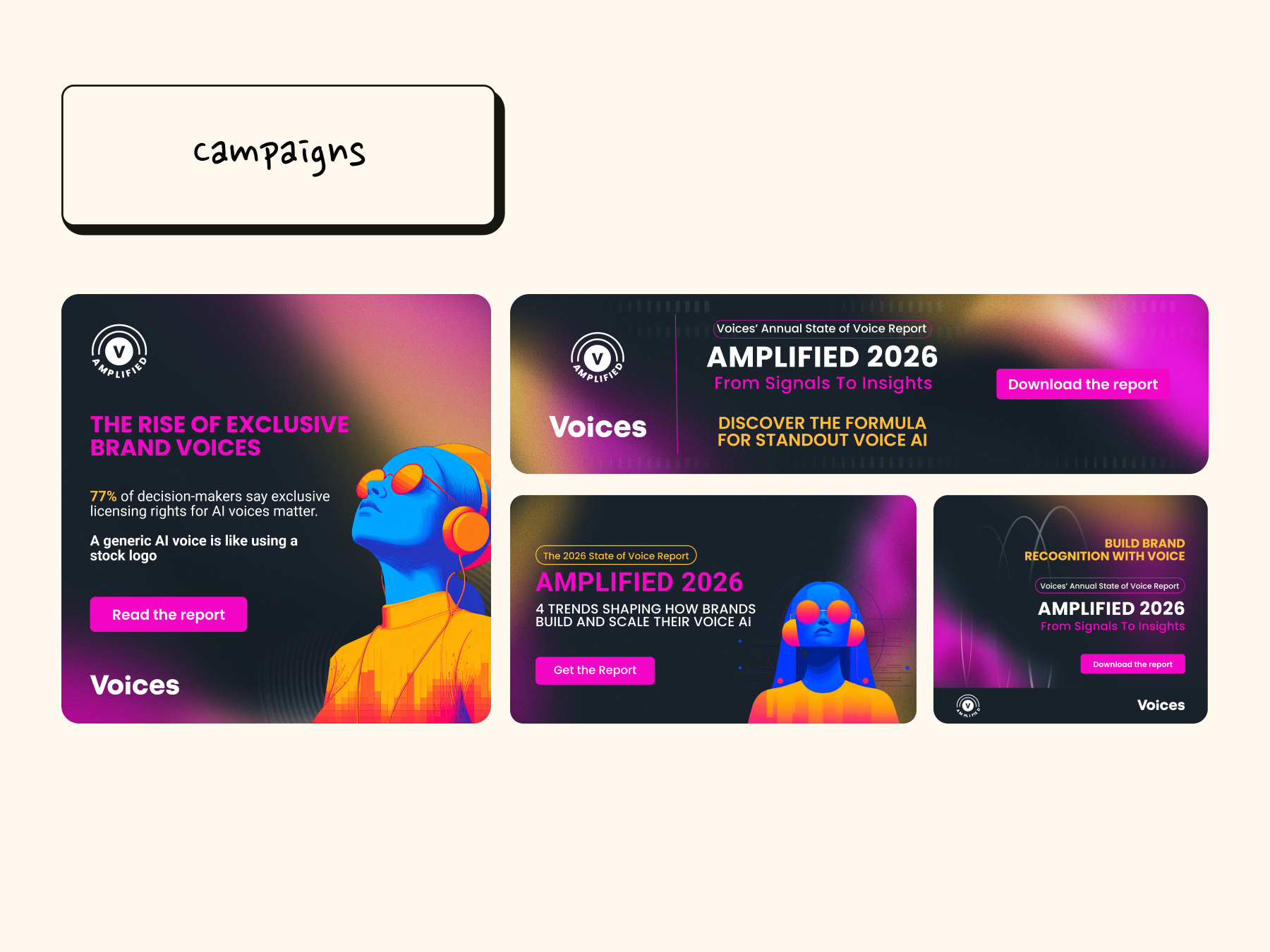 Voices approached me to design the creative direction for their 2026 annual State of Voice Report, Amplified: From Signals to Insights. The brief was clear: create a sub-brand that felt distinct from Voices, bold enough to command attention, and cohesive enough to carry across every touchpoint from a fully interactive PDF to social campaigns and email.